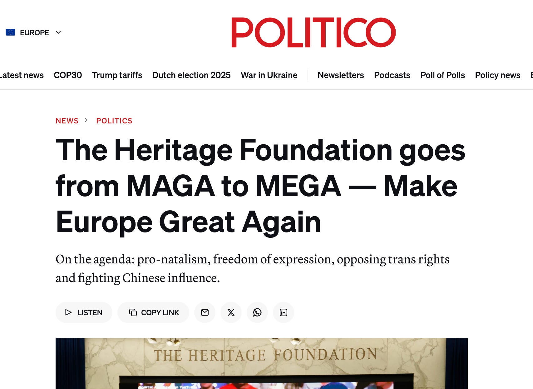 Some observers are doubtful this renewed push will go differently. “I’m skeptical that it will amount to much,” said EJ Fagan, an associate politics professor at the University of Illinois and author of The Thinkers, a book on partisan think tanks. “The European right have their own resources that produce policies, so there’s not a lot Heritage can provide to European parties.” (SOURCE: Politico EU)